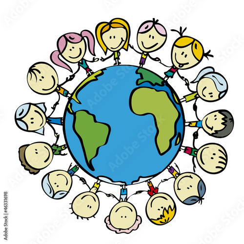 Cartoon Kids Holding Hands Around The World - Group of kids holding hands together around the world with world environment day concept.